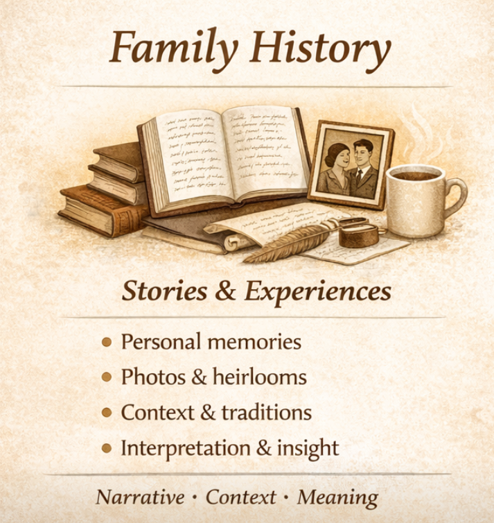Family history explores the human story behind the lineage. Rather than focusing solely on relationships and records, it seeks to understand how ancestors lived, what they experienced, and how their lives were shaped by their environments.